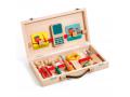 - Coffret complet comprenant plusieurs accessoires : tournevis, marteau, clés, écrous, vis, planches, et bien d’autres éléments pour reproduire les gestes des grands.