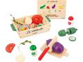 - Jeu d’imitation comprenant des légumes en bois (aubergine, tomate, oignon, courgette, poivron, etc.), une cocotte, une cuillère et un couteau adaptés aux enfants.